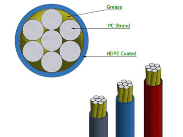 Cáp có cấu tạo gồm 1 bó cáp từng sợi riêng lẻ có đường kính 12.7mm hoặc 15.24mm ở bên trong và được bao bọc với phần vỏ bọc nhựa, mỗi sợi cáp đơn sẽ có đầu treo riêng, được căng riêng theo từng sợi. Giữa vỏ nhựa và cáp có lớp dầu cho phép cáp di chuyển bên trong vỏ nhựa này.